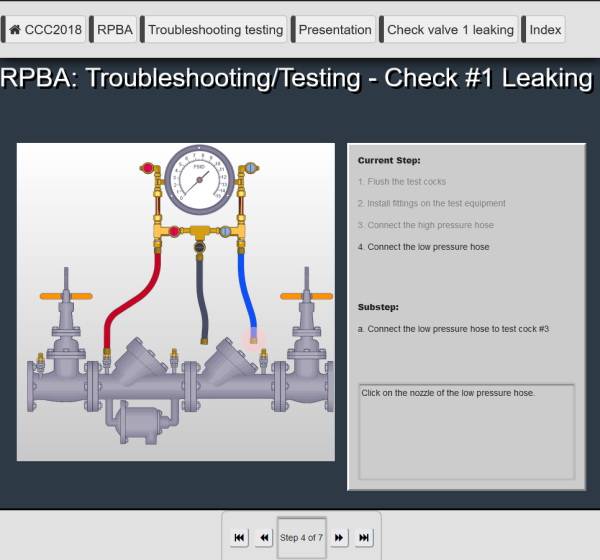 The core of the application was the step by step interactions, which could be given in a lesson form where the student was free to go back or forward in steps to see all the actions needed to test the check valve, or in an exam mode, where penalties were given for making an incorrect choice in the testing / troubleshooting procedure. Failure would mean the student would be encouraged to review the chapter’s content and try again.
